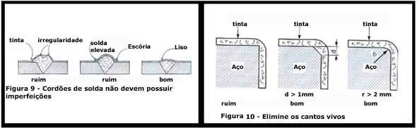 Os cordões de solda não devem possuir imperfeições (asperezas, espirros, furos etc.) que dificultem o recobrimento do sistema de pintura escolhido. Soldas feitas em campo muitas vezes são irregulares e tornam o recobrimento da tinta desuniforme. Haverá pouca tinta nos picos e muita tinta nos vales. O sistema de pintura, desse modo, não atingirá a durabilidade estimada pelo projetista.